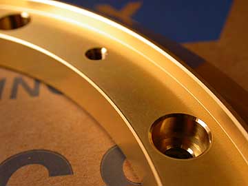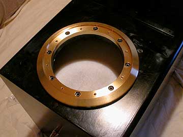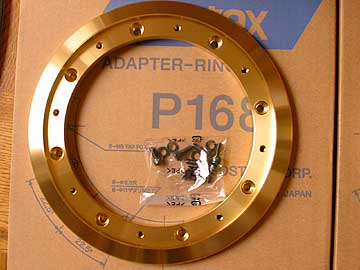 | こちらはフォステクスロクハンユニット専用に発売されているP168。俗にPリングと言われているもの。ユニットとエンクロージュアの間にPリングを挿み込むことで、ユニットの固定が安定し、音質が向上する。素材は砲金で、その物性も音質向上に寄与しているものと思われる。厚みは最上部で 、ユニット取り付け面とエンクロージュア接触面の間で ある。P168はFE168ES/FE168EΣ/FW168Nに適合する。FE164/FE167/FE166Eなどはフレームの形状とネジ穴の位置が合わないため、Pリングを利用する事は出来ない。具体的な取り付け方法は、まず、Pリングをエンクロージュアにネジ止めし、次いでユニットをPリングにネジ止めする。だから、Pリングにはエンクロージュア結合用の穴8箇所と、ユニット結合用のネジ穴8箇所、つまり計16箇所のネジ穴が開いている。ちなみに、取り付けネジはM5サイズのものが8本付属している。価格は 円/枚。素材代と加工代を考えると、このくらいの値付けになるのは仕方ない。 | |||
