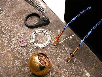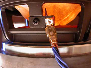 ターミナルの取り付けを終えたら、お次はユニットと内部配線ケーブルをハンダ付けする。接合には前述のように、ターミナル用スリーブを用いている。また、ハンダ付けした周辺は酸化防止のためにチタンオーディオオイルを塗り、さらに保護チューブを被せている。配線が終了したら、ユニットをPリングにネジ止めしてやる。これで制作作業は全て完了!!!!!あーーー、やったぁ。悪戦苦闘の1ヶ月間。やっと完成したぞ〜。さぁ、お次はいよいよ音出しだ!
