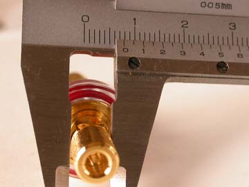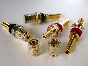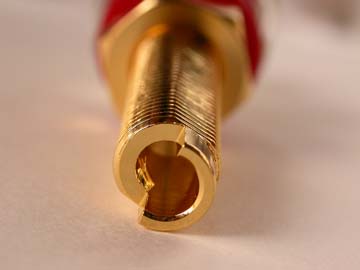 | この大型ターミナルが優れているところは、24mm厚までの板厚を貫通出来るところにもあるだが、もう一点、スピーカーケーブルの固定クランプの構造にある。固定クランプは一般的なネジ止め方式なのだが、このクランプがそっくり取り外せるのだ。WBTもしかりだが、固定クランプが外せない構造になっているターミナルは意外と多い。ターミナルは経年で汚れてくる。その際、クランプが外せるとターミナル清掃時に掃除がやりやすいのである。また、固定クランプには右写真の通り、ギザギザの切れ込みが入っており、スペードラグの固定が強固におこなえる。この機構は意外と貴重。市販されているスピーカーターミナルの固定クランプは通常、この接触面が平らで、スペードラグの固定強度が弱い。配線接続時にきちんと締め上げたつもりでも、時間が経つと緩んでくるのである。その点、このターミナルのように接触面にギザギザの切れ込み加工がなされていると、スペードラグに食い付くように固定出来き、経年による緩みも生じにくい。実際、裸線、バナナ、スペードラグでの固定状態を確認してみたが、いままで私が使ったどのターミナルよりも強力に固定する事ができた。このターミナルの優れたところはもう一点あり、バナナプラグの差し込み穴が、ターミナル本体側の軸に開けられていることだ。バナナ対応のターミナルの多くは、差し込み穴が固定クランプ側に開いている。この場合、音声信号は固定クランプとターミナル本体との接触面を通過する事になり、音質劣化が懸念される。ところがこのターミナルの場合、固定クランプを介さずに本体の軸に直接バナナプラグが差し込まれるため、余計な接点が排除されるのである。このように、細部に様々な配慮がなされたターミナル、これにクライオ処理でもしてやれば、けっこう最強なのではないかなと思ったりもする。素材を純銅にしてやればさらに良いかもしれないが、なんでも純銅にすればいいものではない。こういったターミナルやプラグ関係と言うのは、ある程度の堅さが必要であり、その点で真鍮が多用されているのだ。柔らかい銅を使用すると、強度的、ひいては音質的にも、悪くなることもあり得る。もっとも、これら端末パーツの素材、さらにはメッキ手法などについても諸説うんぬんあるので、ひとくるめに結論しうる事はできないのだが。 | |||