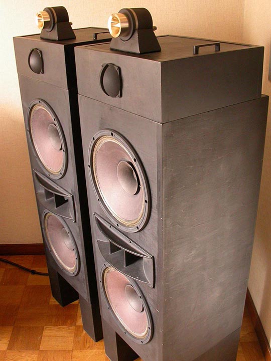 | PA-2を前面より望む。全高129cm。最上面のスーパーツイーターまで含めると全高139.5cm。大型のフロア型スピーカーである。厳密に言うと、大型ブックシェルフ+専用スピーカーベース+専用ネットワークの3段組み合わせ。ユニットやパーツ以外は全て私の自作。スピーカー部の高さ91cm、ベース高さ24cm、ネットワークの高さ14cm。光量の関係からやや白飛びしているが、実際には真っ黒だ。 | |