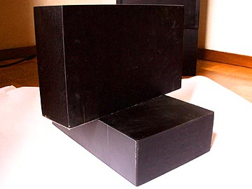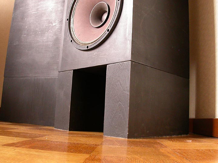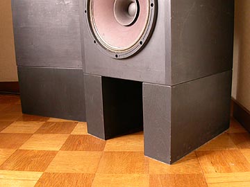 | スピーカーベース。みじんこオリジナル。PA-2にぴったり合うよう設計している。基材はコンクリートブロック。ブロックの内部空間にジルコンサンドをたっぷり封入。周りをサウンドシールドNKというアスファルト系防振シートで覆い、ブチルゴムを積層、最外装をシナ合板で覆っている。叩いても一切鳴きが無く、極めて強固なスピーカーベースが完成した。コンクリートブロックを素の状態で使用していた時と比べると、音質も飛躍的に向上。低域の量感、レスポンスの改善が特に著しい。ベースはスピーカー本体と同色に塗装。見た目のマッチングも良好。広大な面接触なので、安定性も抜群である。ベースの寸法はH240 D400 W105。ベースの重量は15kg弱/台。スピーカー1台に対し2台のベースを用いている。 | |