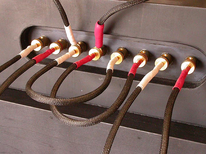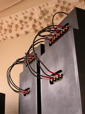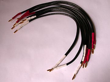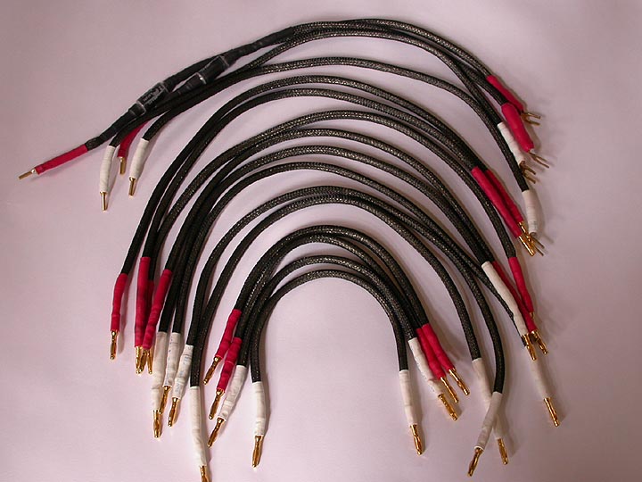 | PA-2改専用ジャンパー線とツイーター線。短い4本のケーブルは高域/低域入力ターミナルをつなげるバイワイヤリングジャンパー線。長い8本のケーブルはネットワークボックス-本体の接続線。一番上側の4本は、スーパーツイーターT925への配線ケーブル。 | |||||||||||||