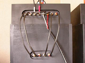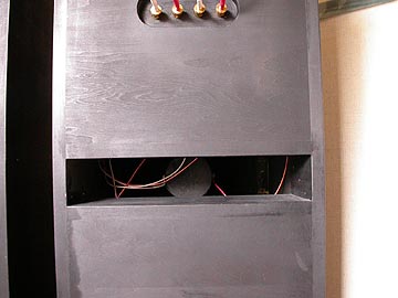 | PA-2改のリアバッフル(背面)。同機はバスレフ方式で、ご覧の通り、背面にスリット型のバスレフポートがある。ダクトの断面積は252平方cm。ダクト長は14cm。計算上のfdは56Hz。40Hzまでの再生が可能。ダクトの形状は長岡先生の設計そのままである。右はネットワークボックスと本体の接続状況。ネットワークボックスにて帯域分離された信号が本体に送られる。これは私の完全オリジナル設計。長岡先生の現設計では、ネットワークは本体内部に取り付け。私もPA-2の製作当初、長岡先生の指定通り、ネットワークを本体内部に内蔵していた。PA-2の指定ネットワークはPS300側がコイル1個による6dB/oct。FT600がコイルとコンデンサーによる12dB/oct。比較的シンプルなネットーワーク回路ではあるが、スピーカーボックスの内部に、ごちゃごちゃと回路がむき出し配置されているのは性に合わない。よって、このスピーカーを製作する当初から、ネットワーク回路の外付け化を視野に入れていた。それを具体化したのが、このPA-2改最終バージョンである。外付けネットワークボックスの製作記については別項にまとめてある。 | |||||||||||||