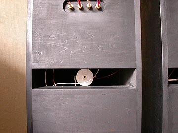 | ダクトの様子。ダクトの中に見える丸いものはFT600のドライバー。片側はブチルゴムと防磁シートが貼ってあるが、もう片側はドライバーそのまま。なぜかというと、以前、片側のFT600のドライバーが不調で、フォステクスでドライバー部分を交換してもらったから。交換後、ブチルゴムを貼らずにそのままの状態でスピーカーボックスに取り付けた。使用上の差は感じない。 | |||||||||||||