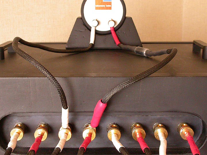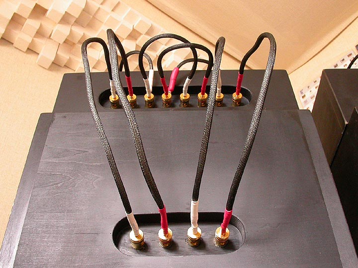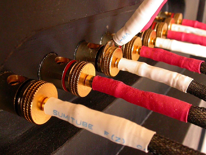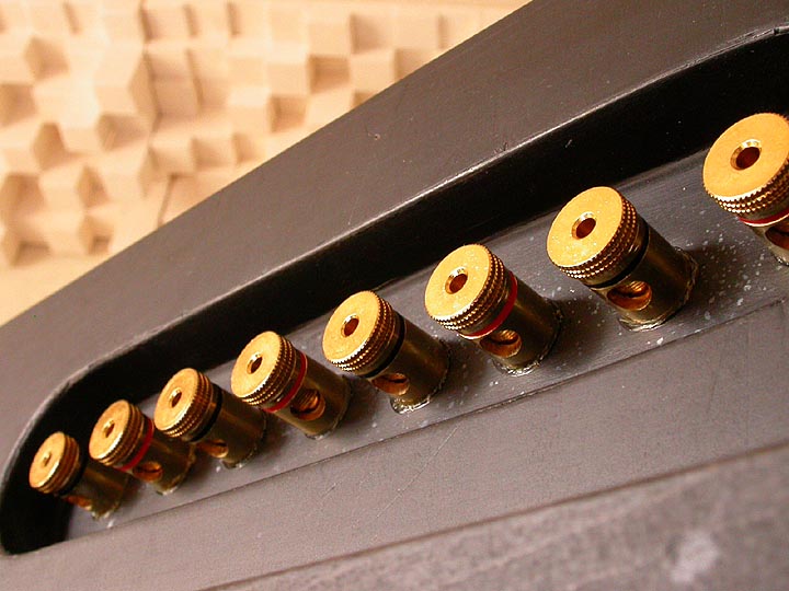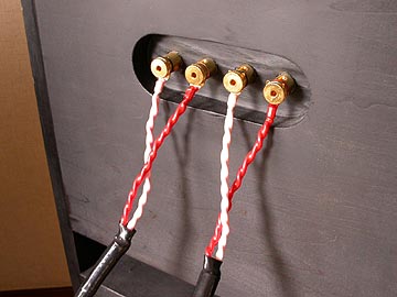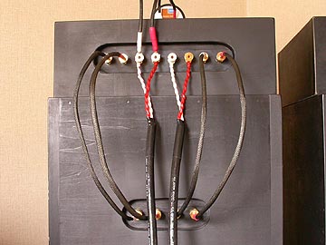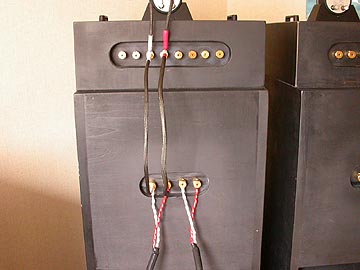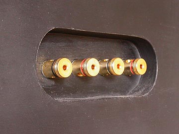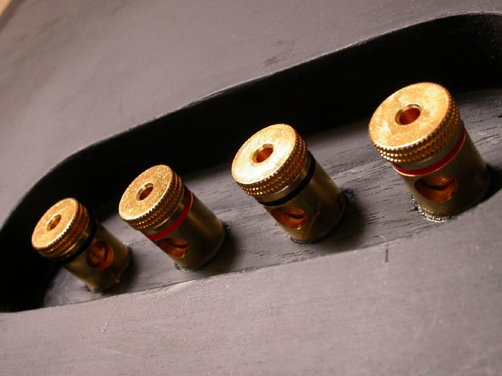| ターミナルの真ん中4個はアンプから信号を受ける入力ターミナル。U字状に配線されている短いジャンパー線は、バイワイヤリングジャンパー線。両端のターミナルは本体スピーカーへの出力ターミナル。少々ややこしいのだが、これもまたこのスピーカーの味の一つである。 | |||||||||||||