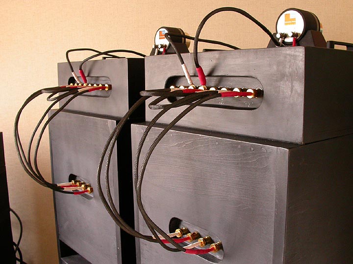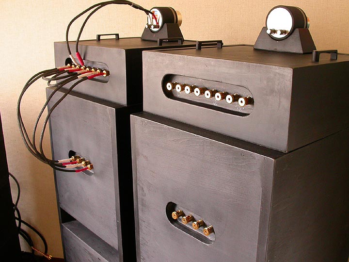 | ネットワークボックスの外付け化には、様々な目的があった。まず、ネットワークパーツをいつでも変更できるようにしたかった。様々なカットオフを試してみたかったのだ。さらに、スピーカーボックス内部の強烈な振動からネットワークを保護したいという目的もあった。高級スピーカーにはネットワークボックスを外付化している例が幾つかある。ネットワークボックスを天板に載せる事で、スピーカーを重さで抑え込む事も考えての事である。実際、このネットワークボックスは重量が25kg弱ある。蓋にTGメタルの鉛板を使っているからだ。また、このネットワークボックスにジルコンサンドを流し込みたいという目論みもあったのだが、それはいまだ実行に移していない。さらに、ネットワークボックスの入力ターミナルをバイワイヤ対応、つまり、低域用と高域用にそれぞれ設ける事により、バイアンプ駆動を可能とした。将来的には、ネットワークの分離によるチャンネルデバイダー導入も計画していた。つまり、ネットワークボックスを介さず、チャンネルデバイダーで帯域分離した信号を本体側ターミナルに直接送り込むことを考えていたのだ。すでにこの計画は断念したのだが、チャンネルデバイダー内蔵プリアンプC-AX10を導入するつもりだった。 | |||||||||||||