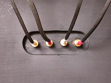 | 左はバイワイヤリングジャンパー線。長さ約15cm。両端はバナナプラグ。右はネットワークボックス-本体の接続線。長さ約25cm。両端バナナプラグ。 | |||||||||||||