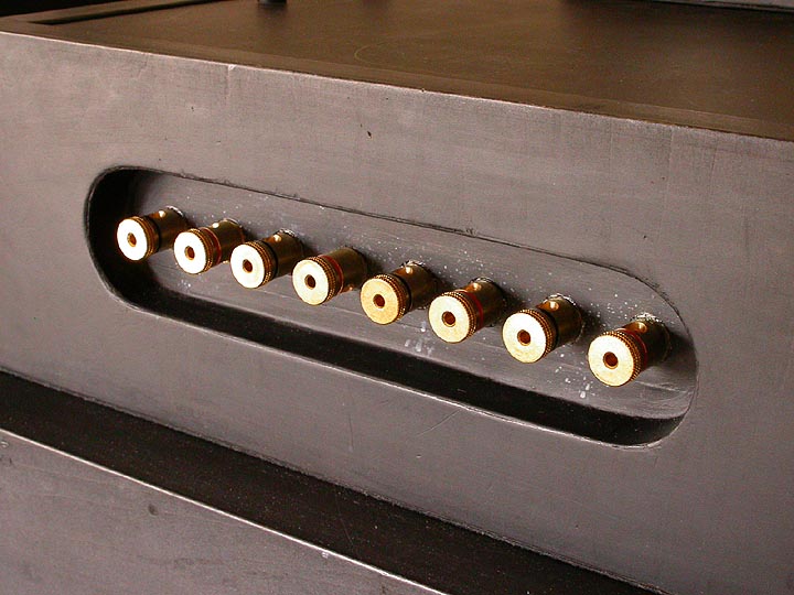 | ネットワークボックスターミナルのアップ。接着剤を塗ってから穴に挿し込み、裏側をナットで締めている。差し込み時に、ケーブル直付け挿し込み穴の方向がばらついてしまった。右から5番目のターミナルである。基本的にはバナナプラグを使用するので、直付け挿し込み穴の位置が斜めを向いていても、使用上差し支えない。 | |||||||||||||
