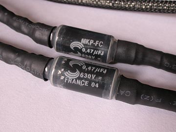 | スーパーツイーターT925への配線ケーブル。SOLEN(ソーレン)のポリプロピレンフィルムコンデンサーMKP-FC(SCRシリーズ)0.47μFをケーブル途中に埋め込んでいる。カットオフ周波数は43kHz。