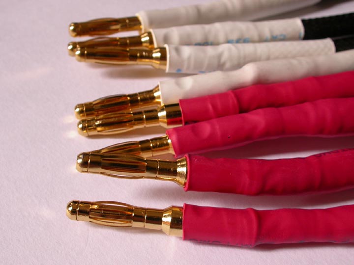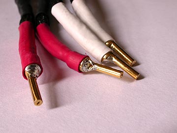 | 端末のバナナプラグ。金メッキ真鍮の良質品。ターミナルへの挿し込み感はきつ過ぎず緩過ぎず、良好である。モンスターケーブルかモニターか、そこらへんのものだったと思う。 | |||||||||||||