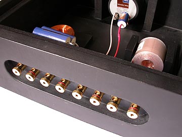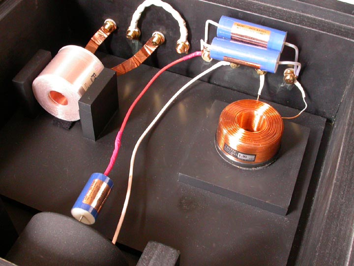 | ネットワークボックスの蓋を開けた状態。ネットワークパーツが整然と配置されている。箱の手前左側にちらりと映っているコイルは、本来の回路構成とはなんら関係ない。以前、高域側回路に使っていて今は使っていないコイルを、そのまま箱の中に置きっぱなしにしていたのを忘れていて、撮影してしまったのだ。 | |