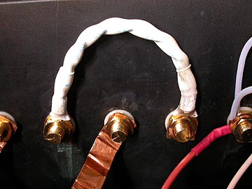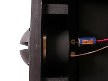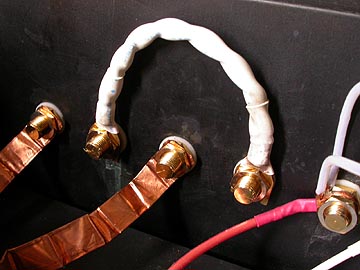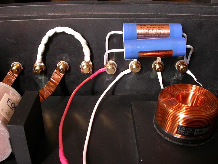 | 低域側のマイナス側内部配線。S/ALABのハイエンドホース3.5の芯線を2本ツイストし、ジャンパー線としている。全体に就職チューブを掛けている。低域側のマイナス側には特にネットワークパーツは接続されないので、このような内部ジャンパー線で配線している。プラス側の配線も少し映っているが、こちらには0.3mHの銅箔コイルが直列接続されている。 | |