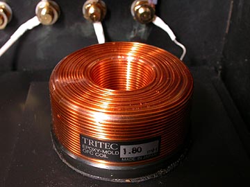| TRITECのエポキシモールド空芯コイルECシリーズ。美しいコイルだ。容量1.8mH。導体はOFCで構成。ECシリーズはTRITECの最上級シリーズだ。コイズミ無線での実売価格は2,740円/個。電流通過による発振を抑え込むため、エポキシ樹脂で固められている。かなり凝った造りのコイルである。