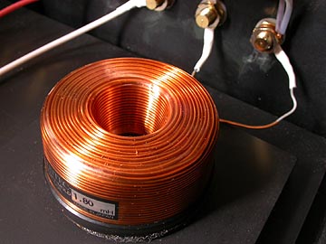 | 左側のコイルはDIYAUDIOの銅箔コイル。コイルには高域信号をカットして、低域信号のみを送り出す作用がある。型番はFA-3821。容量は1.8mH。帯幅41mmの幅広銅箔タイプであり、DIYAUDIOの中でも最も高価なシリーズである。