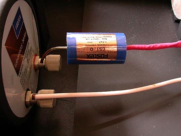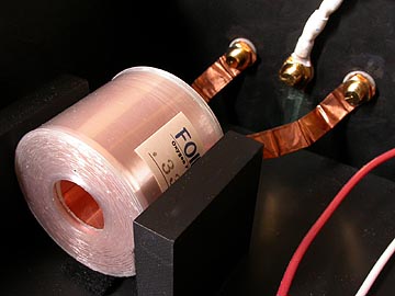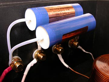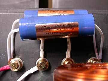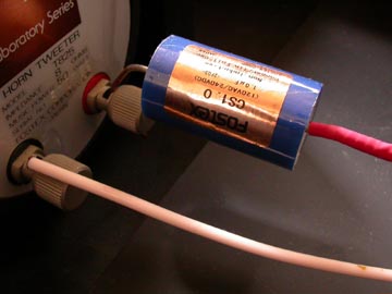 | FOSTEXの最上級CSコンデンサー。ハイパス回路にシリーズ接続(直列)されている。2.2μFを2個パラレル使用(並列)で、4.4μFとしている。リード線にはテフロンチューブを使用。端末を輪っか状に加工し、表面をヤスリで少し平らに削り、ターミナル接触部との接触面積を増大。ターミナルへネジ留め固定している。これら端末加工の仕方は、PA-2専用外付けネットワークボックスその2ネットワーク回路の取り付けに詳しく紹介している。 | |