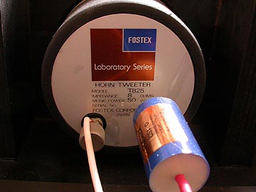 | T825にはフォステクスのCSコンデンサー1.0μFを仲介させ、20kHzの6dB/octのハイパス駆動としている。接続はとりあえず正相だ。場合によっては逆相接続がいいかもしれないが、双方をじっくり比較試聴して決めれば良い。T825のドライバー部はT925と寸法的に同じで、たぶん内部構造も同様だと思われる。ただ、ホーン部分が独特なラジアルホーンになっている点と、再生周波数帯域が20kHz止まりであることから、T925とは再生時の印象は少々異なる。T825はスーパーツイーターというよりツイーターであり、かなりガッツのあるサウンドでもある。T925もかなりビシバシくるけど。 | |