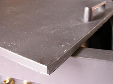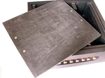 | 背面端子の状態。このネットワークボックスは上蓋が10mm厚の鉛板で出来ており、その10kgあまりの重さで強力に重量付加を掛けている。この鉛板はTGメタルのもので、一般的にはオーディオ機器の天板に載せるスタビライザーとして利用される。私はたまたまこれを2枚所有していた。ネットワークボックスの製作を思い立った際、ネットーワクボックスの蓋にこの鉛板を使えまいかと思いついたわけ。んで、鉛板を蓋に適合するようノコギリでカットし、取っ手を付け、裏面には片面粘着式ブチルゴムシートを貼付け、全体を黒く塗装して蓋にしたのだ。 | |
