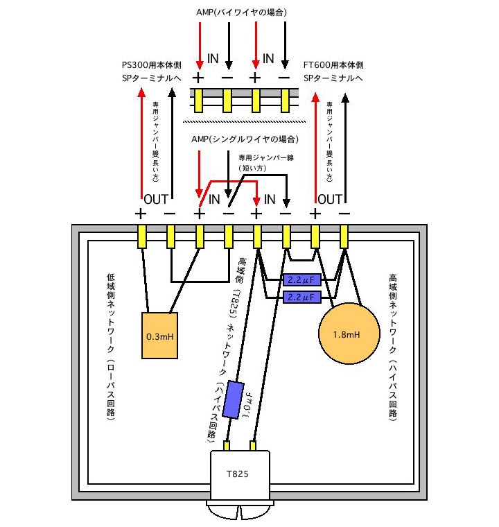低域側は0.3mHのコイルでハイカット。コイルのみの直列接続なので、減衰曲線は6dB/oct。PS300が2発なので、インピーダンスは4Ω。したがって、カットオフ周波数は2.1kHzとなる。 高域側は2.2μF×2個で4.4μFの、直列接続。さらに、1.8mHのコイルを並列接続し、12dB/octとしている。厳密に言うと、4.5kHzの6dB/octから始まり、1.8kHzにて12dB/octへ下降する2段階式のハイパスフィルターとなる。 スピーカーのネットワーク回路に詳しい人なら、この回路図を見て、おやっ?と思うかも知れない。そう、FT600へのハイパス回路は逆相接続となっているのだ。ただ、これは長岡鉄男先生がPA-2用に設計されたネットワーク回路そのもの。決して配線ミスではいないのだ。このスピーカーにおいては、FT600には逆送接続が向いているとご判断されたのだ。 逆相接続については、容易な説明がしにくいので省くが、2way以上のユニット構成の場合、考えなければならない事柄なのである。正相接続なら、IN+からOUT+へ、IN-からOUT-へ接続する。かたや、逆相接続の場合、IN+からOUT-、IN-からOUT+への接続となる。これにより位相が反転する。 |