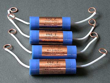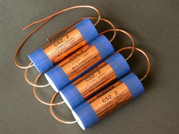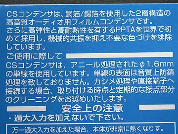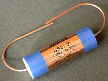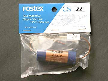 | こちらは今回採用するフィルムコンデンサー。贅沢にもフォステクスのCSコンデンサーを使うことにした。実売\3,349/個だから、4個で\13,396にもなる。一般的なコンデンサーの何倍もの値段だ。それでもなぜCSコンデンサーを採用したかというと、コイズミ無線でコンデンサーを数種類試聴させてもらったことがあって、CSコンデンサーはエネルギーが抜群で鮮烈。他のコンデンサーと圧倒的な差を見せつけたためだ。これは、破壊的再生音のPA-2にふさわしいコンデンサーだ。繊細な表現力も多少は有しているが、元気のよさが勝っているため、人によって好き嫌いが分かれるコンデンサーであるとは思う。 | |||||