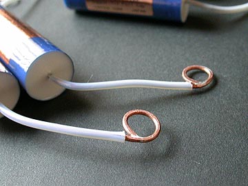| なお、端末は私がリード線をリング状に加工した。ターミネルのポールをこの穴に通し、ナットで締め上げてやることで、コンデンサーのネジ止め固定が可能となった。リード線にはテフロンチューブを被せている。