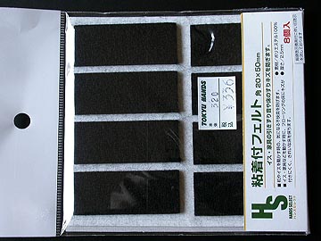 | これが使用したフェルト。東急ハンズで売られている。カット済みで売られており、とても使いやすい。片面が粘着式になっているので、あとは貼付けるだけだ。 | |||||