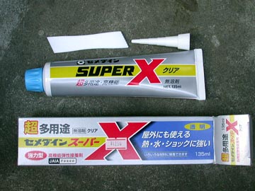 | セメダインスーパーX。これはシリコン系の多用途接着剤。木材/金属/樹脂など様々な素材の接着に効力を発揮し、しかも接着力が強力。たぶんこの手の接着剤の中では接着力は最強だろう。固まってもある程度の弾力を有しているので、多少の防振効果も備えている。江川三郎先生はスーパーXに制振合金M2052粉末を混ぜ込んで、制振パテなるものを発案されていた。ただ、この接着剤、防振効果があると説明書に書かれている訳ではない。