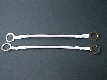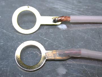 | 次にターミナル接続用の端末金具をハンダ付けする。この金具はスピーカーターミナルに付属してたものだ。右は出来上がったネットワーク配線。ターミナル同士をボックス内部で結合させるジャンパー線として使用する。 | |||||