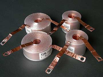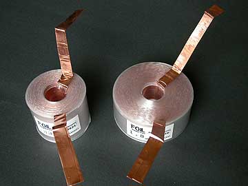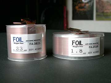 | 今回採用することにしたDIYAUDIOの銅箔コイル。帯幅41mmの幅広銅箔タイプがFA-3821の0.33mH。帯幅25.4mmの幅狭銅箔タイプがFA-2516の1.8mH。銅箔コイルは銅単線コイルに比べ直流抵抗が低く、機械的振動に強いといった利点があり、音質的に優れているといわれている。銅箔コイルは銅単線コイルに比べかなり割高なのだが、その中でもDIYAUDIOの製品は比較的手が出しやすい価格帯である。銅箔にはOFCを採用しており、説明書を見る限りでは導体抵抗も低いので、製品としても質は悪くないようだ。FA-3821の方が抵抗値が低く、音質的に有利だが、価格はFA-2516の3割増。両方FA-3821にすればいうこと無しなのだが、それではコストが掛かりすぎる。コイズミ無線の方に相談したところ、ネットワークに直列接続される方はFA-3821にして、並列接続される方にFA-2516をあてがえばいいでしょうとのこと。直列接続される方が音質的な影響度が大きいので、より良質なコイルを使った方がいいという判断だ。合点承知!そんなわけで、この組み合わせと相成った。