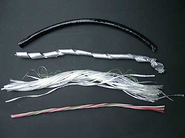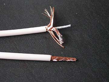 | こちらはネットワーク配線に用いる線材。S/ALABのHH3.5だ。HH3.5をばらして芯線のみを利用する。右はHH3.5の芯線の端末加工の様子。撚り線をいったんほぐして、中心のコア材を切断。再度撚り直してやる。コア材があると導体を金具に巻き付けにくい。音質的にも、端末のコア材は取り除いた方が良いと言われている。 | |||||