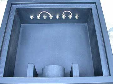 左は東急ハンズのオリジナル製品“ハンズセレクト”のラッカースプレー。垂れがなく、発色が良く、霧が細かく、同種の中では最も優秀だ。これでコーリアン材をスプレーする。元の色は茶色、白、オレンジなど様々だったが、全部黒く塗装してやったのだ。ま、別に塗装なんかしなくてもいいんだけど。 コーリアンはデュポン社の開発した人工大理石。加工性が良く、塗装も容易。防振効果に優れているので、近年はオーディオ分野での応用例が見られる。私もオーディオボードやスピーカーバッフルに利用したことがある。 |
