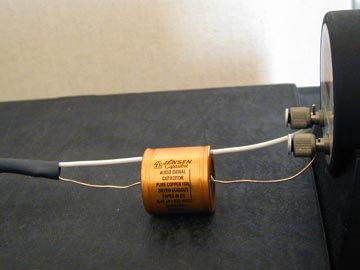 2004年4月にコンデンサーを交換した。これは、デンマークのジェンセン製オイルコンデンサー。銅箔で、容量は0.47マイクロファラッド。音が良いと評判だ。購入は秋葉原山手線高架下の春日無線変圧器。最後の1ペアだった。価格はペア\4,800。ジェンセンオイルコンは秋葉原でも入手が極めて困難だが、海神無線で入手可。なお、ジェンセンオイルコンは2004年4月に1.5割程の価格上昇があり、ペア\7,800に跳ね上がった。