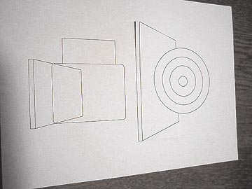 | さて、ここからはT925用鉛台の製作について解説しよう。まず、台のイメージを検討し、等寸大の型紙をパソコンで製図。製図ソフトはクラリスワークスのドローモードを使用。これを厚紙にプリント。この型紙を元に、原型を製作する。 | 厚紙を切り抜き、発泡スチロールに貼付ける。貼付けにはスプレー式スチロール糊を使用。普通の発泡スチロールだと高精度なカットができないので、高密度発泡スチロールを使うのがコツ。高密度発泡スチロールは東急ハンズで入手できる。 |