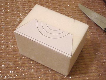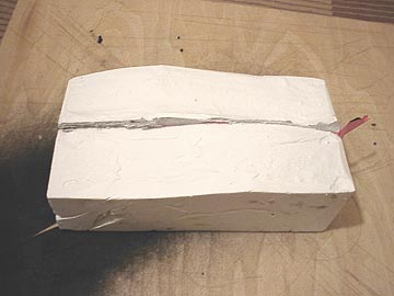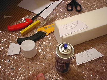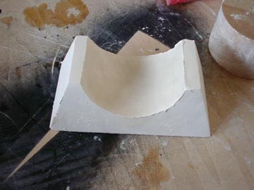 | 貼付けた型紙に沿って、カミソリノコギリでスチロールをカットする。カッターナイフだとナイフの反りでカット面が湾曲する危険性があるので、カミソリノコギリを使うのが良い。カットはまず全面をカットし、次いで側面に型紙を貼ってさらにカット。半円部分は板くり抜き用の細いノコギリを使いる。これらカット作業は、スチロール用電熱カッターを使う方が楽だろうが、私は所有していないので、カミソリノコを使った。スチロール用電熱カッターとは、細い電熱線を装着したスチロール専用切断機で、熱を利用してスチロールを切断する。東急ハンズなどで入手可。 | カットしたスチロールを紙ヤスリで整え、フォルモにて成型する。フォルモは水を加えペースト状にして塗り付けるようにすると良い。フォルモとは、人形製作で用いる石粘土のこと。東急ハンズなどのクラフト店で入手可。フォルモ以外では壁用の隙間埋め水性パテも可。有機溶剤系のパテを用いるとスチロールが溶けてしまうので不可。半円部分の成型は直径80mmの木製円柱を使い、成型した。円柱はあらかじめ水で濡らしておき、粘土を塗った半円部分に乗せて、クルクルと回すと綺麗な半円に成型される。なお、木製円柱は東急ハンズで購入。 |