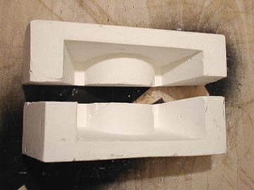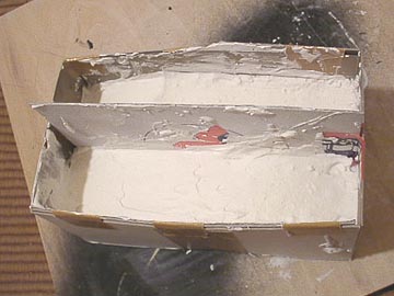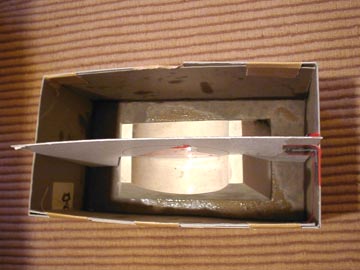 | 水で溶かした石膏がややシャバシャバ気味のペースト状に調整出来たら箱に流し込む。流し込みに際しては、できるだけ空気が混入しないように注意する。割り箸などを用いて、隅の方まで石膏が行き渡るようにしてやると良い。しかしながら、悠長に作業していると流し込んでいる最中に石膏が固まってしまうので、流し込みは迅速かつ慎重におこなわなければならない。 | 硬化中に石膏を触ってみると相当発熱していることが分かるだろう。これは石膏と水が発熱化学反応を起こしているため。石膏は数十分もすればカチコチに硬化する。硬化を確認したら、箱を除去する。そして、1日ほどかけてよく乾かして水分をとばす。水分を含んだままの石膏はまだ硬度が弱いので、高熱の鉛を流し込んだ際に、型が破損する危険性があるのだ。 |