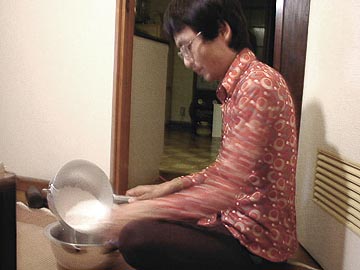 | 箱の内側と型全面にオイルを塗る。これは、原形と後に流し込む型取り用石膏が接着してしまわないようにするため。オイルはサラダ油を使用したが、型取り専用のオイルを用いても良い。なお、石膏型を分割できるように、仕切り用の厚紙を固定する。この仕切りの厚みは原形との誤差になるので、できれば薄いプラ板を使うのが良い。 | 型取り用の石膏を溶かす。水を入れた容器に少しずつ石膏の粉を入れ、その都度かき混ぜて石膏と水が均一に混ざるようにする。石膏と水との割合は1:1くらいだが、実際に混ぜながら粘土を調整する。多量の石膏をいきなり水に入れる、もしくは石膏に水を流し込む、といったことをすると、石膏がダマ状になってしまう。 |