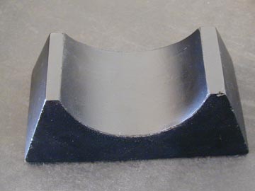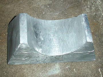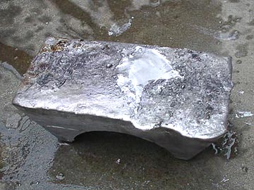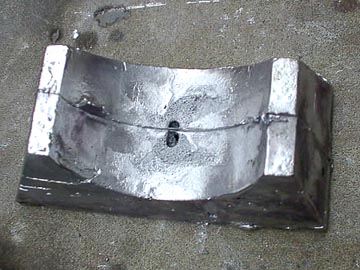 | 型から外した鉛製ツィーター台座。表面が少々粗くなってしまったが、これはヤスリで修正する。ペアでTGメタルを2本半使用した。 | 背面は型を接していないので汚い。これもヤスリを使って平らに修正する。型から外した直後は相当な高熱なので、水をかけて冷やしている。 |