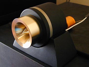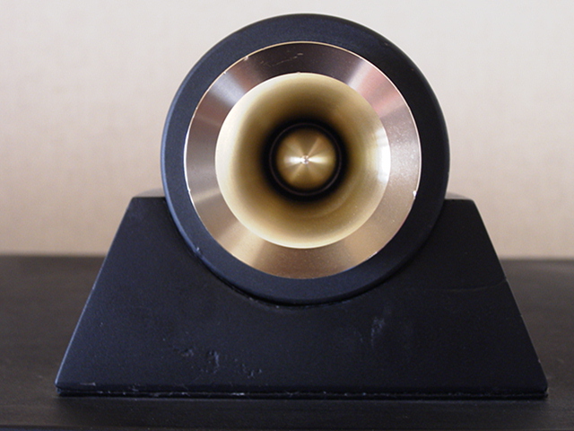 | 大形スピーカーPA-2の天板にどっしり構えるT925。T925はけっこう昔の大形スーパーツイーター。当然ながら中古入手。みじんこはPA-2を製作する前から、PA-2に合うスーパーツイーターとしてT925を探していたのだ。T925の外見上の特徴として、ホーン部(真鍮の部分)の直径がドライバー(黒い部分)より小さくなっている。また、ホーン部の真鍮は現行のT925Aより深みのある金色。ドライバー部の直径はφ82、ホーン部はφ60。後継のT925Aは当然ながら音質が向上しているらしいが、みじんこはT925とT925Aを比較試聴したことはない。T925の下の台座はみじんこオリジナルのT925専用鉛製台座。 | FOSTEX T925の背面。FOSTEX Laboratory Series HORN TWEETER T925とある。Laboratory Seriesとはフォステクスの高級ユニットシリーズ。インピーダンス8オーム、最大許容入力50W。端子には少し錆が見られる。端子にはレゾナンスチップを貼ってある。効果は不明。直径がぴったり合ったから張り付けただけだ。最近、レゾナンスチップを剥がそうとしたら、アルミチップの部分だけ取れてしまった。レゾナンスチップの粘着部分はブチルゴムで出来ているらしく、時間経過とともに強固に粘着してしまう。要注意だ。T925へのSPケーブルは、オルトフォンのハイCPケーブル「SPK-3100」を使用。 |