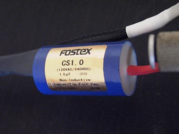 ハイパスフィルターにはフォステクスの新型フィルムコンデンサー「CS」を使用。ずっしりと重いコンデンサーである。容量は1.0マイクロファラッド。PA-2は10kHz以下急降下らしい。そこで、クロスオーバーを低くとるために1.0をあてがったのだが、T925が鳴り過ぎの感がある。T925の能率が高いので、PA-2とのクロスオーバーはもっと高くしないと釣合わないようだ。ということで、いずれは0.68か0.47に交換予定。