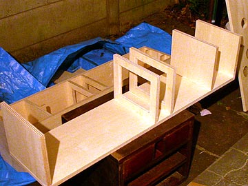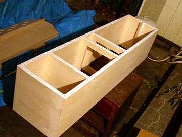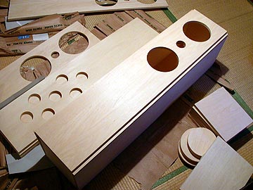 | さて、お次は底板と天板と補強材の接着だ。左上のように側板へ底板/天板/補強材を接着する。手前が天板になる。右上は2枚重ねしたフロントバッフルの状態。 | |||