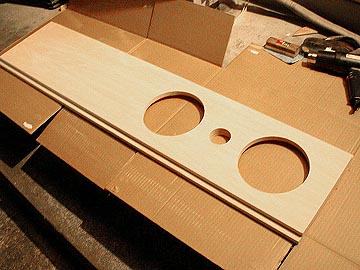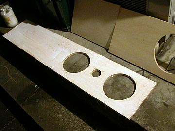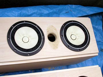 | さらに、板の中心で半分にカット。この板材がどう使われるかは、後ほどご紹介しよう。右上はカットしたボイド管とリアバッフルに空いたダクトの穴。 | |||