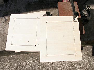 | 接着した板がずれないようにハタ金で押さえる。と、ここで本日の作業は終了。翌日は終日作業を続行。内部の補強板を切り出す。ハンズであらかじめカットしてもらっていた板に線を引き、自分でカットする。このカット作業をハンズでやってもらうと、4枚分で5千円程度はかかる。四角のくり抜きカットは高額なのだ。だから自分でやることにした。鉛筆で線を引いて、四隅にドリルで穴を空ける。ここに糸ノコのノコギリを差し込んで、線引き通りカットしていくのだ。 | |||