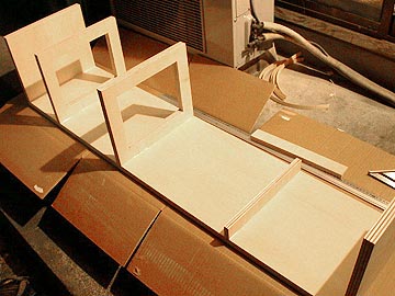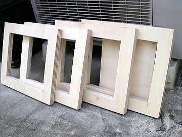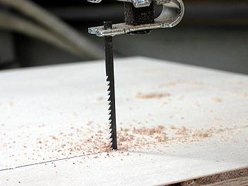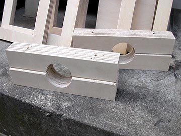 | 糸ノコでカットしているの図。シナ合板は硬くないので、容易に切断できる。右上は切り終えた補強材。各辺から幅4cm分残してある。 | |||