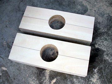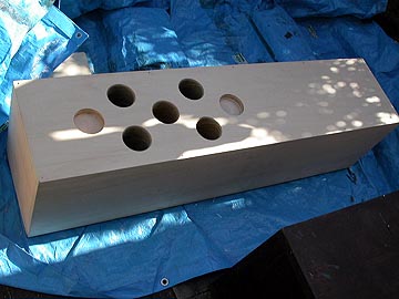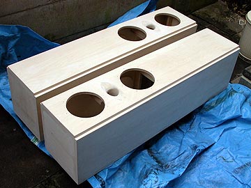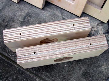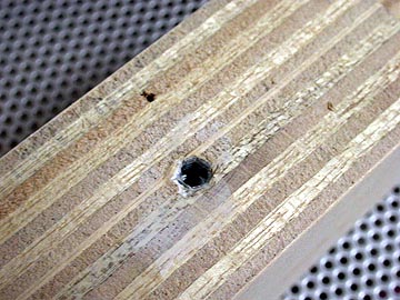 | 次に、ツイーターの固定板を製作する。21mm厚を2枚重ねにし、乾いたら断面にドリルで穴を空ける。 | |||
