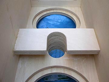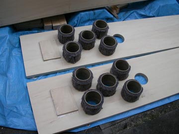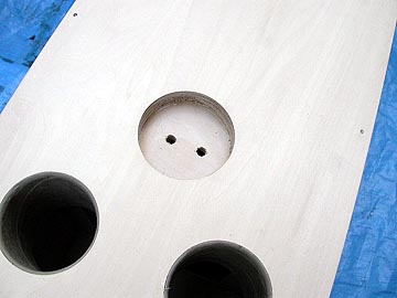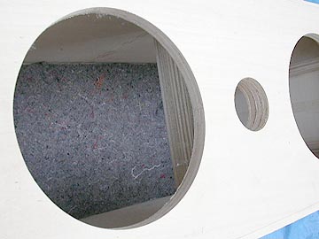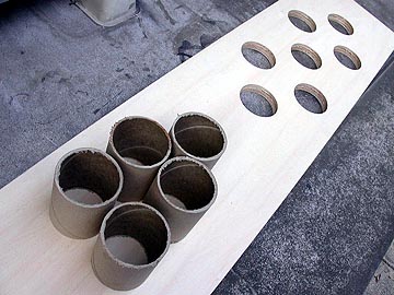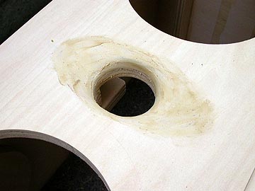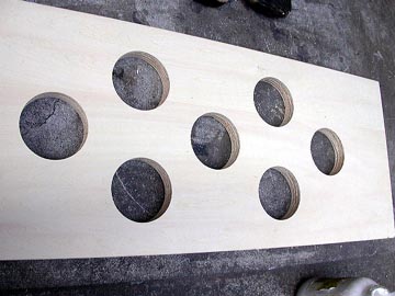 | リアバッフルの状態。幾何学的に真円が並んでる。機能性と遊び心を兼ね備えたデザインにしている。右上はダクトを嵌め込んだところ。木工ボンドを塗り付けてから穴に押し込む。はみ出たボンドはそのままにしておく。この面は箱の内部になるから見えないし、ダクトと板の接着をより強固にするため、ぬぐい取らない方が良いのだ。 | |||