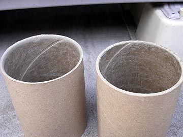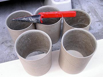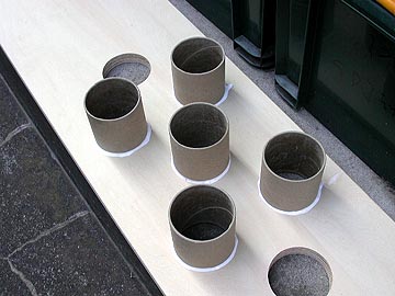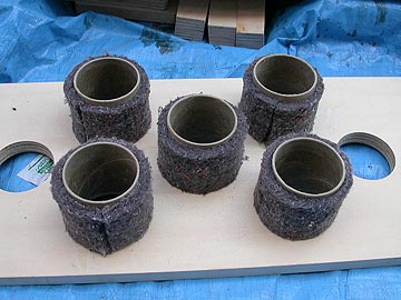 | ボイド管の断面を綺麗に削る。こうすることで、ダクトを取り付けた後、ダクトの断面が目立つことなく見栄えが良くなる。左上の写真の中の左が断面仕上げ前、右が仕上げ後。写真ではなんとも分かりにくいのだが、要は右写真のようなサンダーを使って、断面を滑らかに削っているのだ。この作業は意外と大変で、10本分の加工に2時間かかった。 | |||