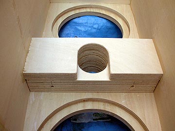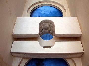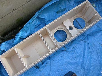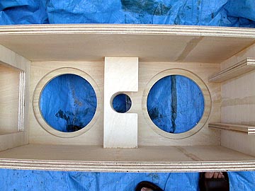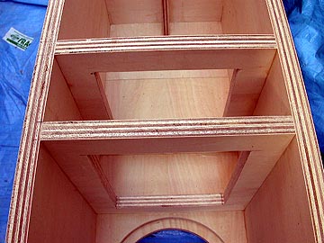 | これは、底面の錘り用砂投入空間。最大で23kg(18L)の砂を入れられる。補強板の接合状態。2枚の補強板を使用している。この構造は極めて強固なもので、このようなトールボーイスピーカーの構造強化にはうってつけの補強方法だ。 | |||