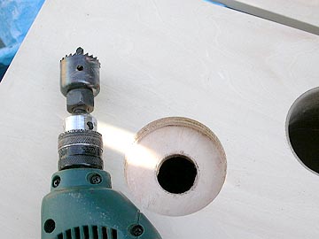 | リアバッフルに設けたスピーカーターミナルポートにターミナル取り付け穴を空ける。さらに、底面の砂投入口用の穴も空ける。 | |||