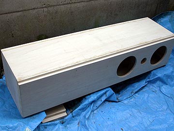 | リアバッフルを接着する。リアの固定のみ釘を使用した。もちろん、木工ボンドを塗ってからである。さらに、板の接合部分に生じたわずかな隙間や段差を木工パテで埋めていく。 | |||