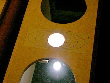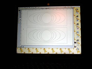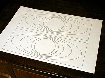 | 次に、ツイーター取り付け穴のラウンドバッフル加工を行なう。まず、パソコンで切削のためのガイドを描く。これをA4サイズの粘着シールにプリント。 | |||