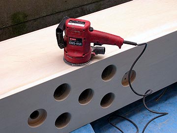 | さて、お次は全体の研摩だ。パテも乾いたので、電動ヤスリで一挙に磨いていく。これで接合時に生じた板のズレや隙間が綺麗に修正できる。粉じんが飛び散る中、ひたすらヤスリをかける。右上はヤスリがけ後の状態。 | |||